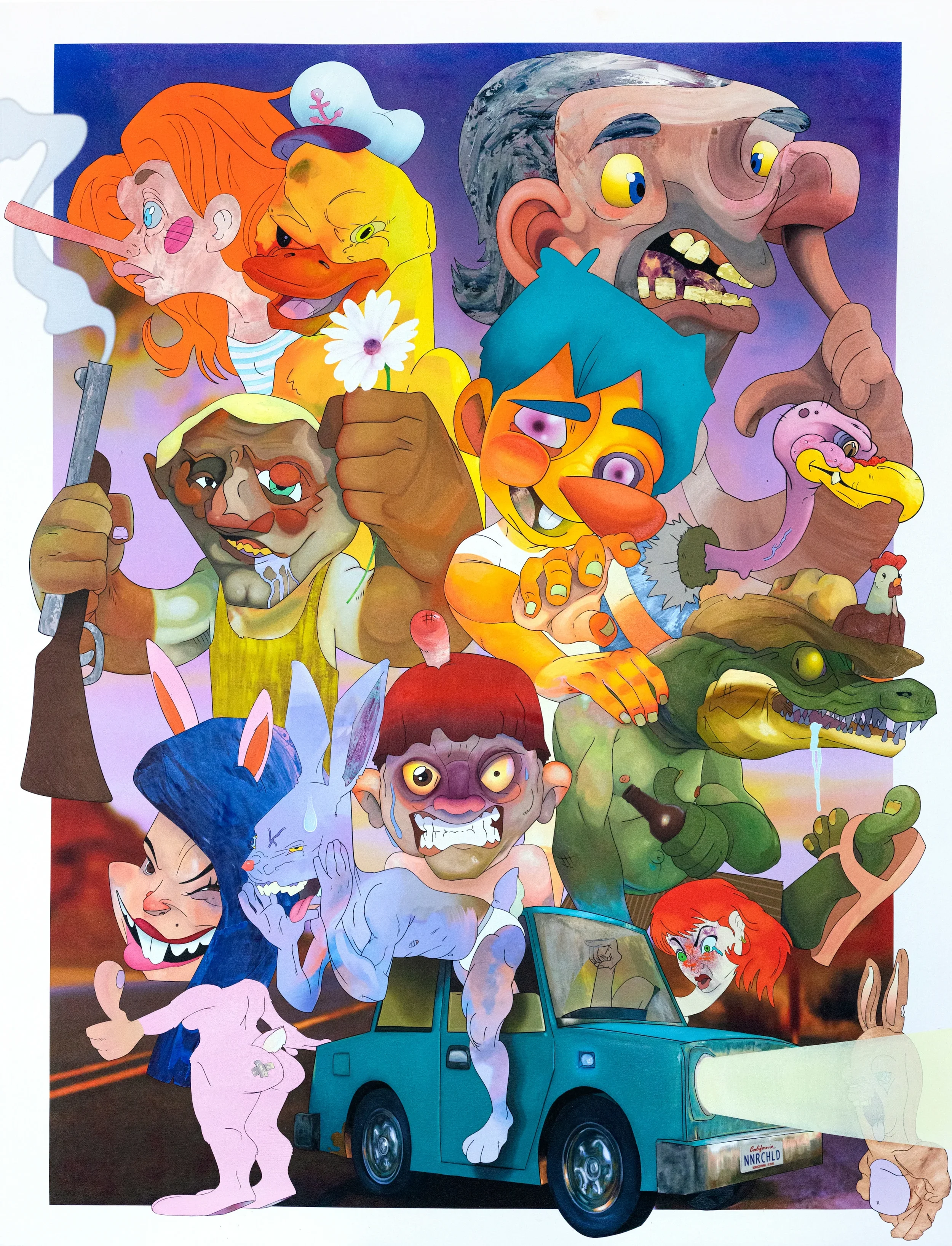 Canyon Castator’s large-scale paintings are a sarcastic impression of the flaws in society. Referencing figures from the internet, media, politics, and personal experiences, the chaotic narratives in his works are inflated with grotesque characters. They explore our relationship with the digital age and reflect on the excessive number of images and content that we are exposed to daily. Castator’s work emphasises a feeling of absurdity when digital and painting techniques merge onto one canvas.