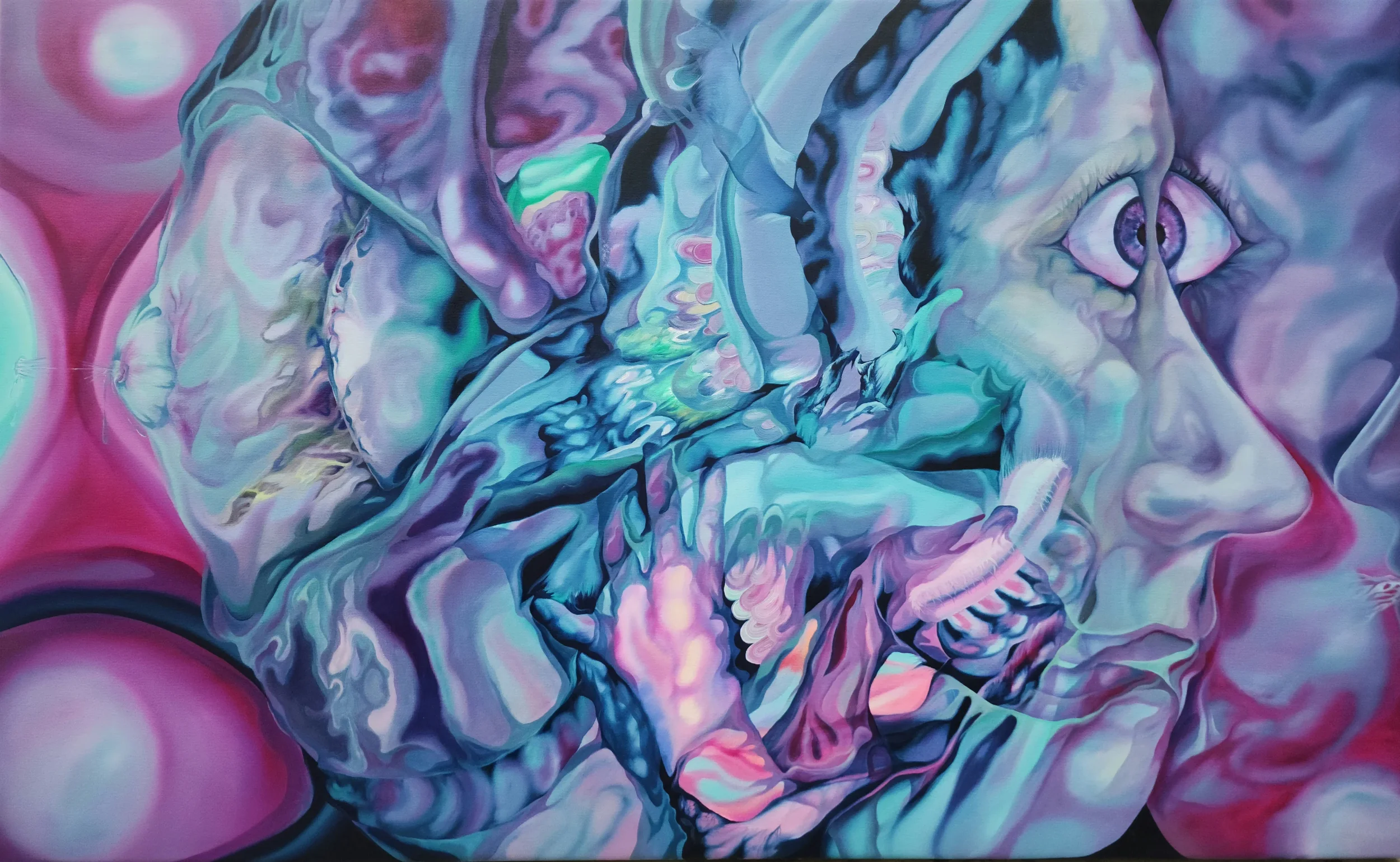 In Haeji Min’s paintings, the idiosyncratic anatomical transformed characters fluctuate between technological future bodies and organic figures experiencing the life cycle. Min marks their presence in controlled brush strokes using oil colours.