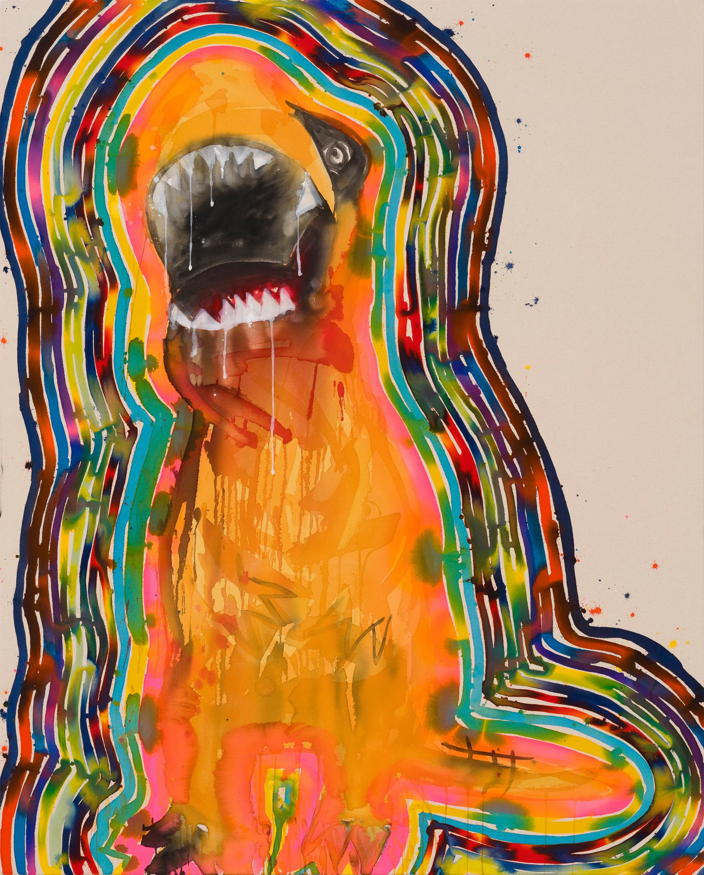Liz Markus paintings are influenced by the rawness of punk and grunge music and culture with which she grew up. Her process is intuitive, and her interest lies in various subjects, including dinosaurs, hippies, cavemen, socialites, witches, monsters, and fashion. She is interested in psychological repression versus liberation. Markus uses bold and colourful washes of acrylic paint, usually on unprimed canvas.