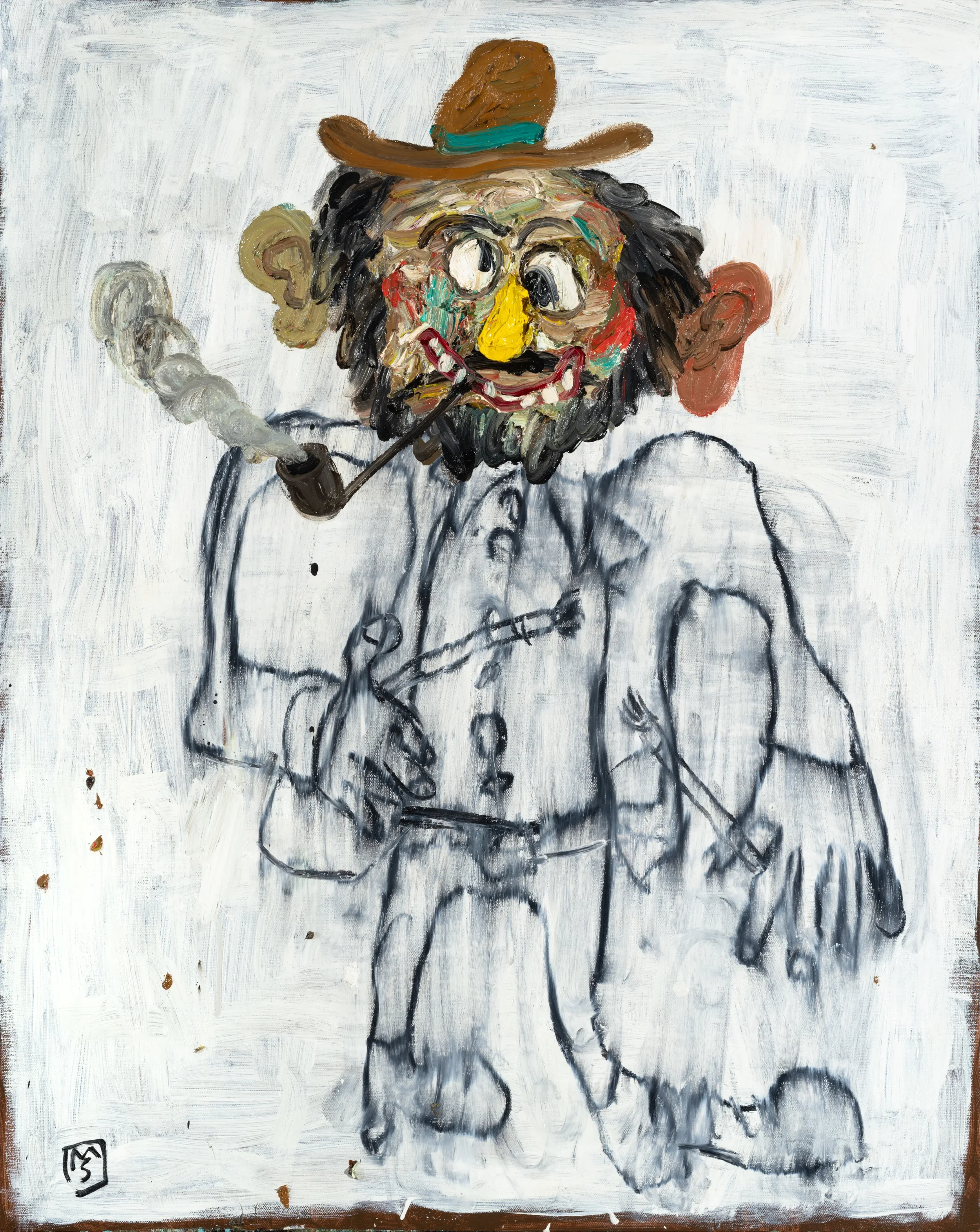 Matías Sánchez is a self taught artist currently living and working in Seville, Spain. Through his own exploration, the artist developed a signature style of vivid painterly surfaces as a backdrop against spirited characters and objects. His aesthetic and sometimes subject pays homage to Post-Impressionist artists such as Paul Gauguin. At times smoothly rendered, at times crudely abstract, the artist uses recurring images including sausages, bones, rats, people with menacing expressions, to form grotesque dreamscapes, exploding with energy.